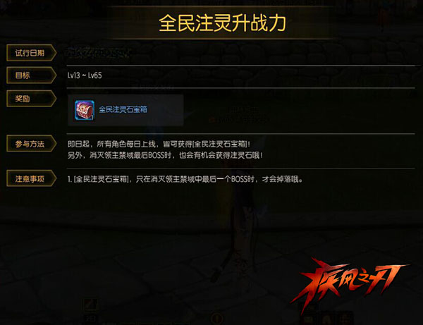 《疾风之刃》国庆活动之全民注灵升战力活动,13级-65级玩家只要登录游戏即可获得[Lv.1~Lv.3全民注灵石宝箱]。此外,活动期间玩家击杀领主禁域的最后一个BOSS时,也可100%获得 [Lv.1~Lv.3全民注灵石宝箱]。活动产出的箱子,打开就能随机获得众多惊喜奖励。