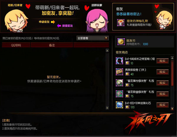 《疾风之刃》国庆活动之“密友活动”,玩家配对好友即可给好友发送丰厚奖励,配对好友赢取更多奖励,好友越多奖励越多。玩家满足每天登陆1次游戏、升级、疲劳值消耗50其中的任意一项,就能获得1次[发送礼包]机会。该礼包包括密友币、密友之礼、家用急救箱、复活石、50% 经验值提升药水、EX 能量提升药水、金色迷恋鱼饵等惊喜。