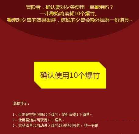 1、点击确定将消耗10个爆竹,额外获得1个道具。