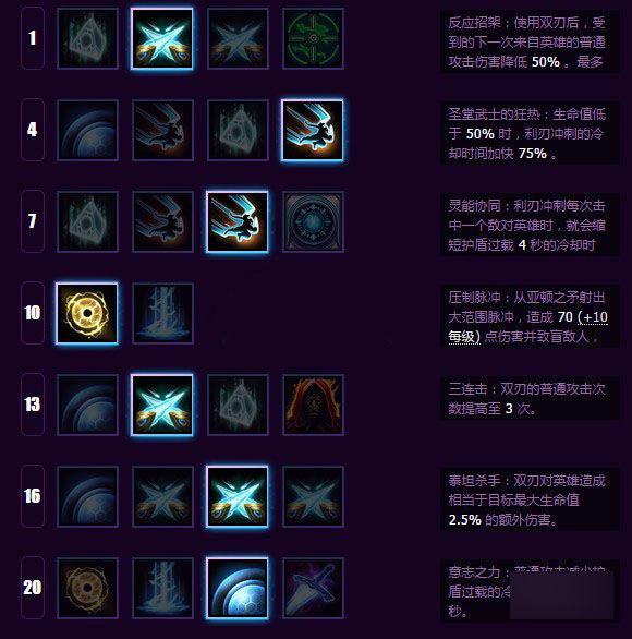 刷新护盾型:利用4级和7级的Q技能天赋刷新护盾CD,13级三连击配合16级冲锋则是阿塔尼斯压制脆皮英雄、W技能刷新CD、W技能提供粘人及位移的重要天赋。20级方面,强化特质可以让一发W刷新18秒护盾CD,或者选择第二发压制脉冲。