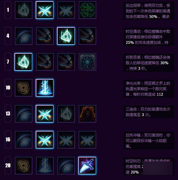 突进粘人型:4级和7级强化E来增加阿塔尼斯的Gank能力,但是对于E的施法精度要求非常高。13级、16级依然是W冲锋为核心的输出型天赋。20级可选范围较大,强化特质、强化大招、强化平A都是可选天赋。