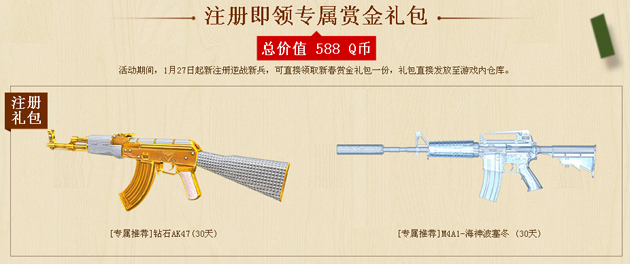 活动期间,1月27日起新注册逆战新兵,可直接领取新春赏金礼包一份,礼包直接发放至游戏内仓库。