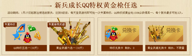 活动期间,1月27日起新注册逆战新兵,达到5级后,每天登录游戏即可抢一次专属特权,QQ特权或黄金枪100%必获得其一,每个新兵最多可抢3次。