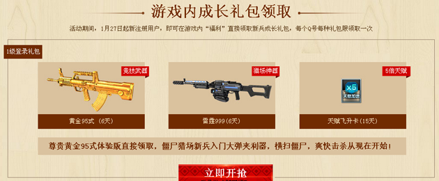 活动期间,1月27日起新注册用户,即可在游戏内“福利”直接领取新兵成长礼包,每个Q号每种礼包限领取一次