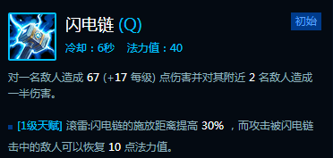 叉状闪电。Q冷却其实很短只有6秒,现在保留两发,开团不停的放吧!