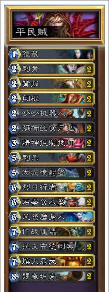 另外,他由于本身卡组随从数量并不足,大约到7-8费回合他就召唤不出随从了。需要注意的是,他有一张特别的随从黑铁保镖,特效就是总能从大乱斗中幸存(一般他会在打出这名随从之后直接接一发大乱斗)