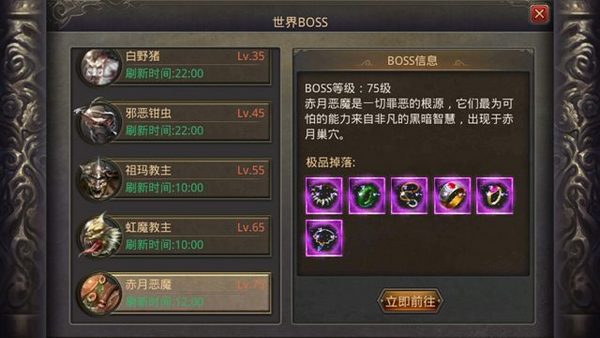 在白日门中,有着让无数玩家闻风丧胆的BOSS——赤月恶魔。通过白日门野外的传送点,穿过无数的迷宫和密道就可以到达赤月巢穴。目前BOSS中血量最高的赤月恶魔不得不说是让不少玩家为之头疼的BOSS之一。虽然体型庞大不能移动,但这并不影响它放出招式的伤害力,再加上那庞大的体力值。可以说赤月恶魔是最为耗时的BOSS!因此,想要击败赤月恶魔,除去拥有30000以上的战斗力外,搜集足够的太阳水和还魂丹以便及时补充体力也是十分必要的!击败 BOSS虽然困难,但得到的奖励却也十分的丰富,稀有首饰、熔炼矿石、祝福油、玄冰铁、技能残页等等。其中稀有首饰就有战士的圣战项链、圣战戒指、圣战手镯,道士的天尊项链、天尊戒指、天尊手镯以及法师的法神项链、法神戒指、法神手镯,这么多的顶级装备,你有没有心动呢?