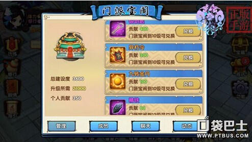 在门派宝阁内,玩家可以使用个人贡献兑换一定数量的道具,商城等级越高,可兑换的道具价值越高。各位童鞋若是想把自己的门派建设的更好,那就把门派所有成员号召起来吧,团结一心,将门派发扬光大!门派越壮大,可以获得的游戏福利也越豪华哟!