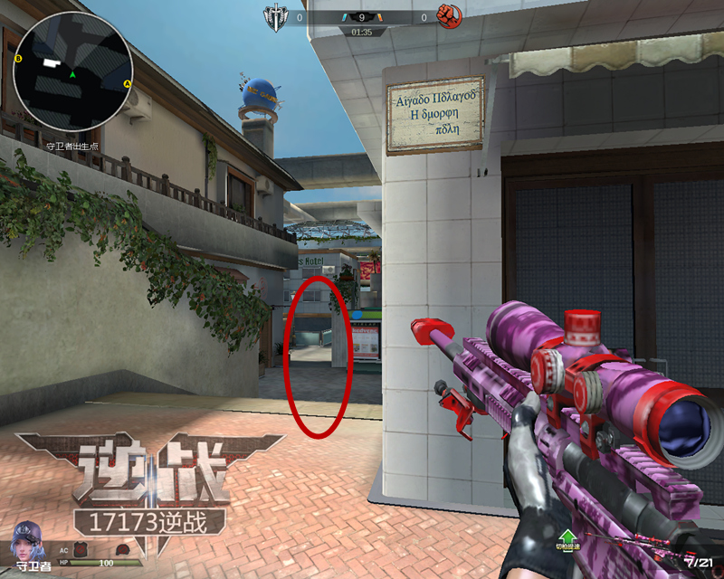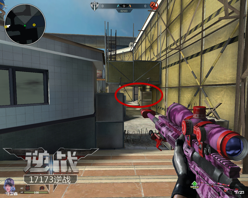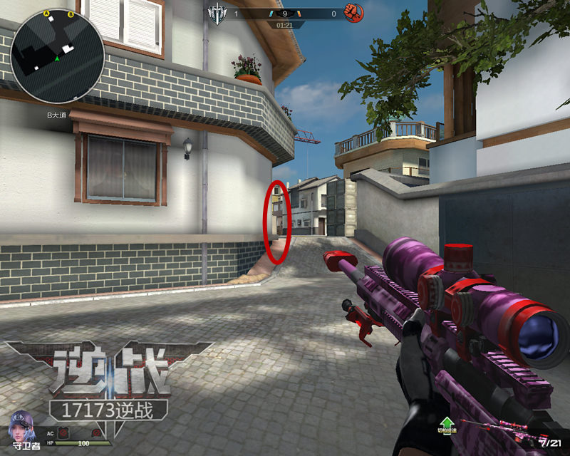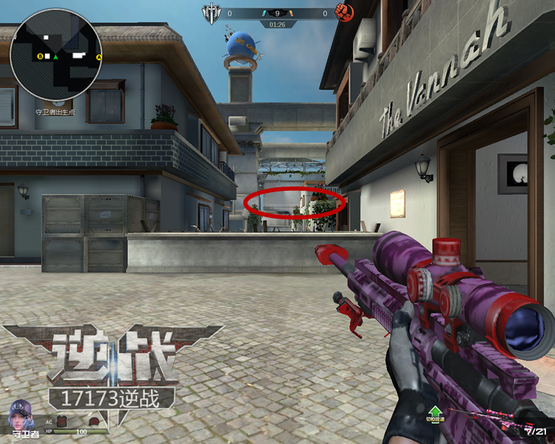 说完了A部分的卡点位,中路的卡点位就不用多说了,中路到守卫者家只有一条路,所以只要提前卡好狙击点就好,对自己瞬狙比较自信的人可以选择此处狙击点较为合适,需要注意的是圆圈右上角的红色幕布那一块也是可以看到敌人的,换而言之也可能有狙击手在看着你……