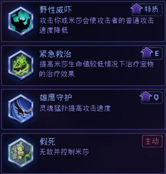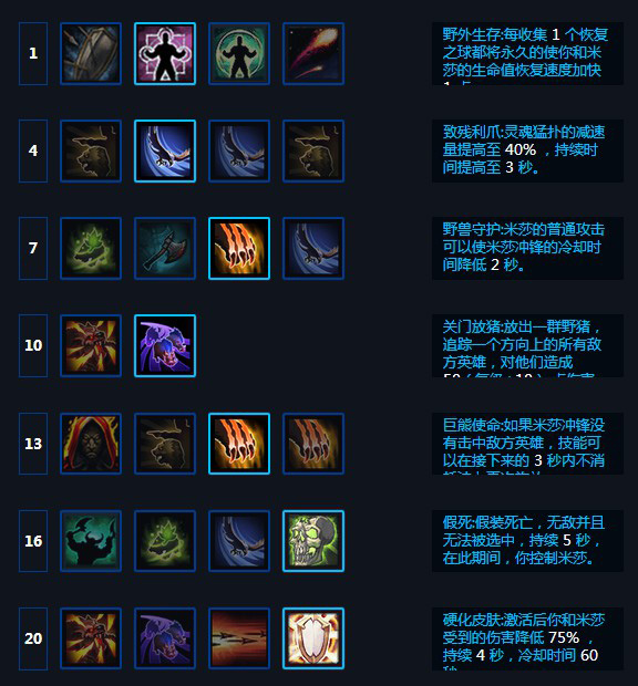 以致残利爪、野兽守护、关门放猪控场型天赋为核心,狩猎刺激则能让米莎更好的黏住敌人。假死和硬化皮肤增强存活能力。