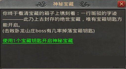 击败卧龙庄主后,还可前往卧龙山庄(62,25)使用宝藏钥匙*1开启神秘宝藏,获得卧龙卷轴-残甲等物品。