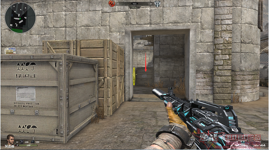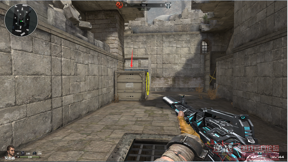1、《巨石城》中路外围,通过黄圈位置观察敌人走向,当有敌人进入箭头所示的箱子后进行穿射,敌人往往死的莫名其妙。
