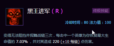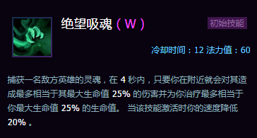 这个技能绝对是骷髅王战场存活的资本,在4秒恢复25%的血量,并且伤害对面25%的血量,先放完一技能,接上W,只要没有位移技能的英雄,4秒基本上很难跑出技能的距离,并且在战场上,放出两个W就能多出50%的血量,并且死亡后一样可以依靠这个技能把血吸满复活,复活后技能CD刷新。