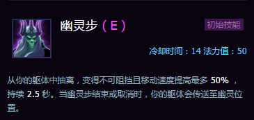 这就是骷髅王的位移技能,施放E的时候,控制灵魂往前走,等到时间到了,或者打断了后,人会飞到幽灵的位置,也就是说,技能释放的时候,本体是不动的,容易被群殴,所以最好随手放个W,再往前走。移动速度提高50%也算可观。