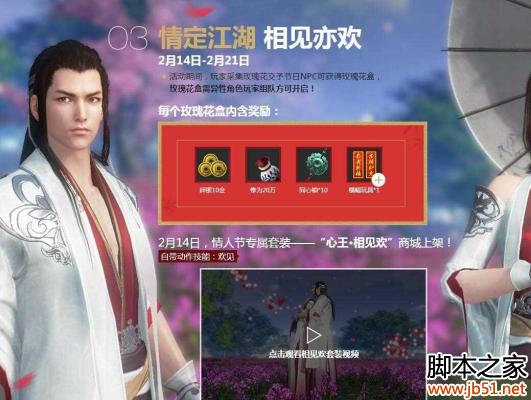 3、情定江湖,相见亦欢。情人节活动时间为2月14日-2月21日,玩家采集玫瑰花交于节日NPC即可获得玫瑰花盒,花盒需要异性玩家组队方可开启。同时,2月14日上新情人节专属套装:心王-相见欢。