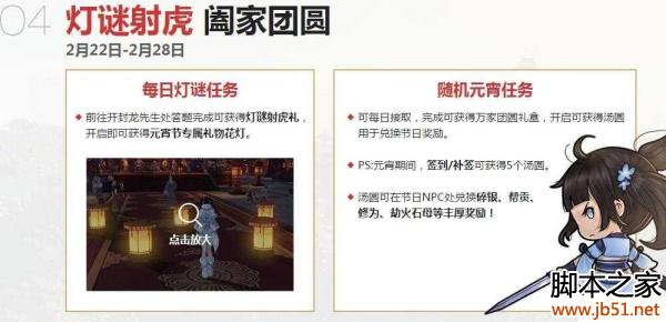 4、灯谜射虎,阖家团圆。元宵节活动时间为2月22日-2月28日,玩家可接取每日灯谜任务,在开封龙先生处答题完成可获得灯谜射虎礼,开启可获得元宵节专属礼物花灯。每日还可接取随机元宵任务,完成可获得万家团圆礼盒,开启可获得汤圆用于兑换节日奖励。