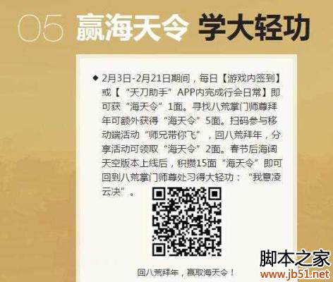 2月3日-2月21日期间,每日【游戏内签到】或【“天刀助手”APP内完成行会日常】即可获“海天令”1面。寻找八荒掌门师尊拜年可额外获得“海天令”5面。扫码参与移动端活动“师兄带你飞”,回八荒拜年,分享活动可领取“海天令”2面。春节后海阔天空版本上线后,积攒15面“海天令”即可回到八荒掌门师尊处习得大轻功:“我意凌云决”。