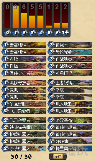 这套照原版,去掉了一个救赎、2个小蜘蛛、大宝剑、蛤骑士、军需官,生平;加入了佛爷、砰砰、欧罗塞布这三张后期牌,还有一张英勇圣印,猫头鹰过墙/占场,增加斩杀。