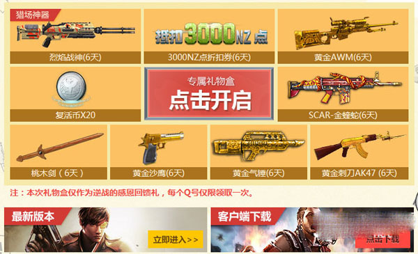 感谢您一直以来对《逆战》的给力支持及理解,幸运之礼以作答谢,赶快点击你的专属礼物吧。