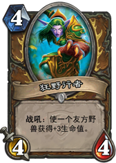 这张牌战吼效果是非常不错的。对比牧师的黑暗教徒,亡语才能给随机的随从 3生命值,荒野行者却是战吼,而且是指定的 3生命值,但是,战吼条件的苛刻性意味着,只有野兽德的卡组才能加入。