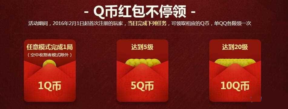活动期间,2016年2月1日起首次注册的玩家,当日完成下列任务,可领取相应的Q币,单QQ各限领一次