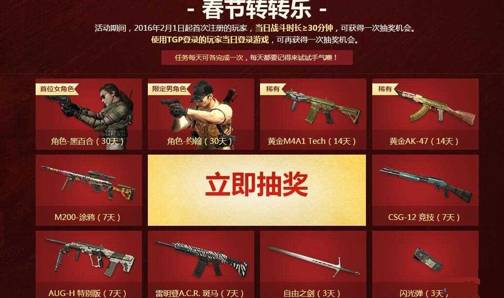 活动期间,2016年2月1日起首次注册的玩家,当日战斗时长≥30分钟,可获得一次抽奖机会。使用TGP登录的玩家当日登录游戏,可再获得一次抽奖机会。