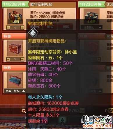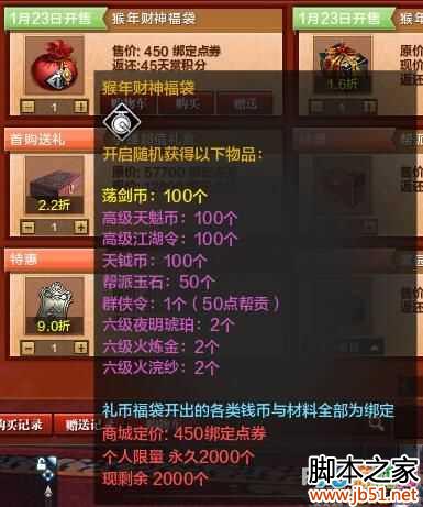 以上就是小编给大家带来的天涯明月刀猴年商城礼包内容介绍的全部内容了,希望大家喜欢,祝大家游戏愉快!更多实用攻略,更多最新消息请继续关注JB51!