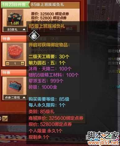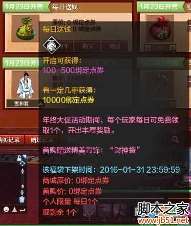 答:1月23日~1月31日商城每日每人限领1个,开启可随机获得100-500绑定点券, >>详细