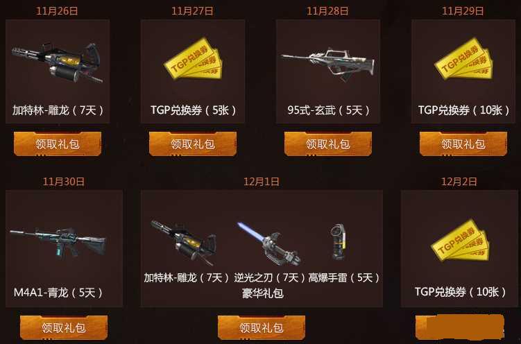 11月26日—12月2日,每日登录TGP客户端,并使用QQ浏览器打开本页面即可领取当日的登录壕礼。单个QQ每日限领一次,奖品有限,先到先得。