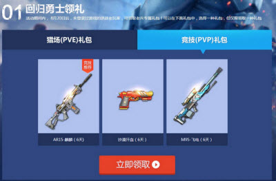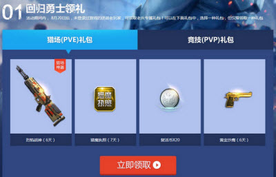 活动期间内, 8月20日后,未登录过游戏的逆战老玩家,可领取老兵专属礼包!可以在下面礼包中,选择一种礼包,但仅限领取一种礼包