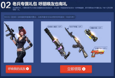 活动期间内,只要您是9月2日前已创建角色的逆战老兵,向以前一块奋战的好友发出一份呼唤邀请,即可领取老兵专属礼包!每个Q号仅限 领取一次。