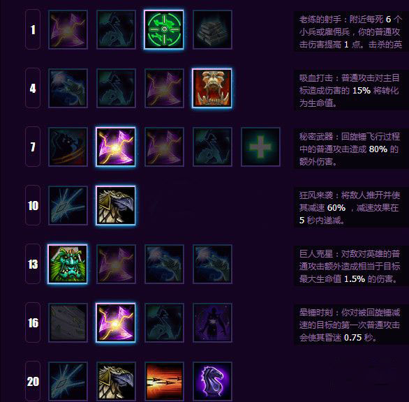 老练的射手(1) 能从分推中收益良多,而 吸血打击(4)则为你赖线提供了续航能力。之后的天赋,秘密武器(7),巨人克星(13),晕锤时刻(16)的组合,能够让你迅速击杀被 狂风来袭(10)分隔开的落单敌人。
