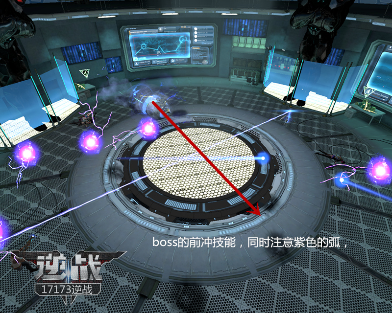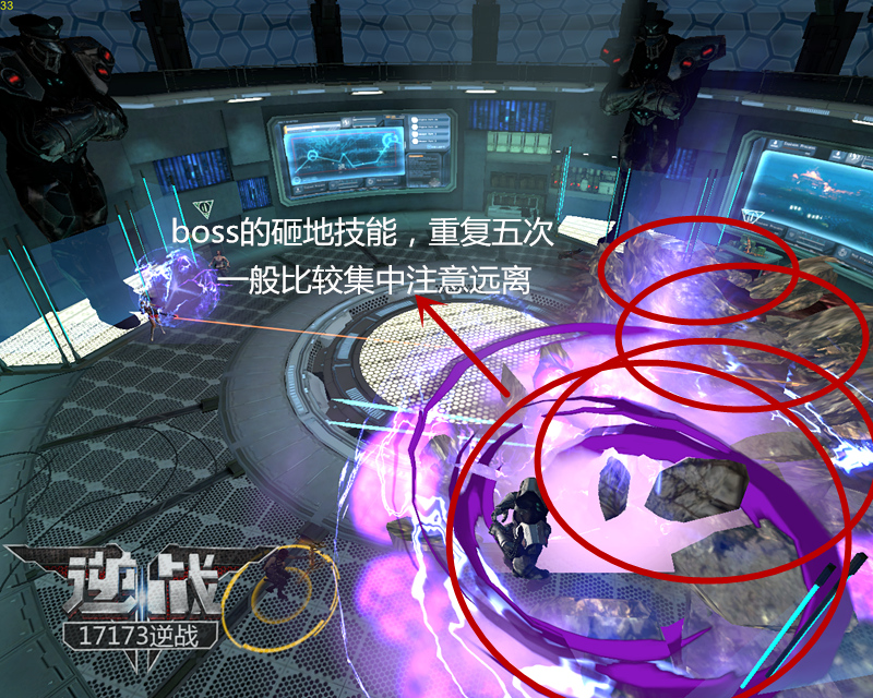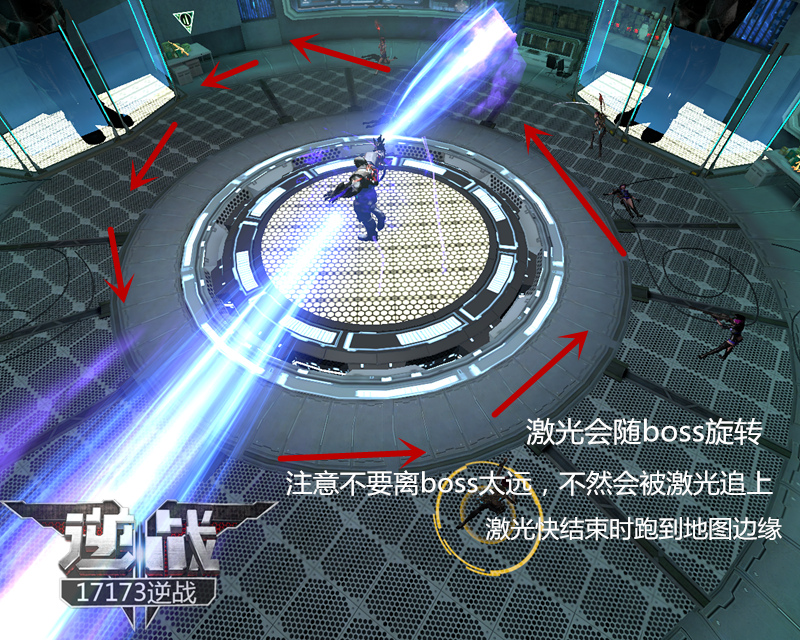 这个技能是在boss的第二形态释放的,boss会释放一个光线,范围是全图都可以达到,并且会一边放一边旋转,这个时候如果你离boss比较远的话那么就很容易被激光追上,在周期相同的情况下离圆心越远线速度越大,所以这个时候适当离boss近一点是比较好躲的,但是需要注意的是,这个技能放完的时候要立马往外圈跑,不懂的看下一张图……
