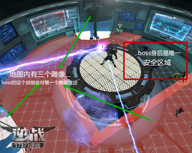 这个技能是贯穿整个游戏的,不管第一形态还是第二形态,攻击方式和范围都是没有区别的,这一关的地图是一个圆形区域,在三个地方均匀分布着三座boss的雕像,这个技能就是由boss的雕像发出来的射线,被打到必死,好在这个技能也比较好识别,就是在boss跳进中央的高台,而且高台在上升的时候,boss就是要放这个技能了,安全区域是boss身后,在高台升起来后,高台后面是一片盲区,所以见到boss这个动作,就立马躲到boss身后输出就可以了……