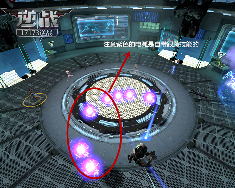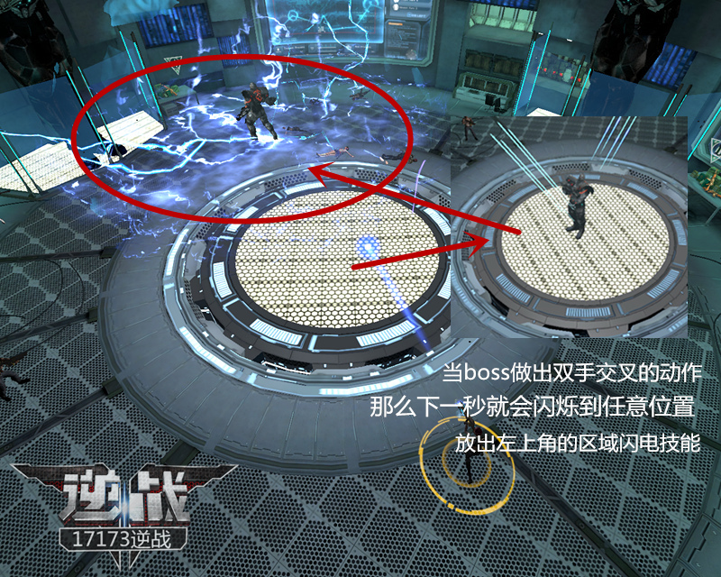 接下来就是一个比较头疼的技能了,因为你无法知道boss的攻击地点是哪里,技能前兆是boss进入地图中央的圆形区域,双手交叉置于胸前做祈祷状,这时候他下一秒就说闪烁到地图的任意位置,然后直接释放一个区域的闪电技能,几乎是没有反应时间的,所以建议大家尽量分散开来,这样就可以减小死亡率……
