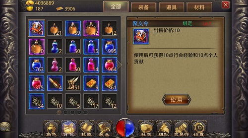 了解了行会主界面之后我们来了解一下行会声望,行会声望我们可以通过挂机活得的聚义令和在行会管家中进行任务获得,一个聚义令可以获得10个行会贡献和10 点行会经验,一个任务可以获得相同的数值,并且在行会商人处可以通过行会贡献来购买商品,虽然每天的贡献值可获取的不多,但是日积月累我们也能获得相当可观的声望。