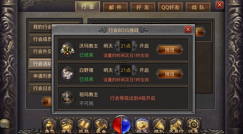 接着,我们可以参与每天的行会BOSS挑战,BOSS挑战可以提供相当可观的金钱物品以及绿色套装装备,可以通过行会会长来设置每天的BOSS挑战时间和BOSS种类,只要积极参加,我们可以获得丰厚的奖励和装备!