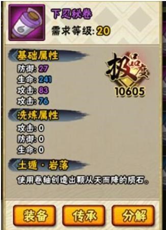 土遁岩落:使用卷轴创造出颗从天而降的陨石。陨石可以造成大范围攻击,不过命中率不算高。