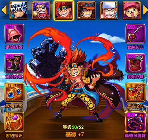 基德金属臂(宝物25阶后解锁):提升怒气攻击效果,任何攻击吸取攻击力效果持续1到3回合。