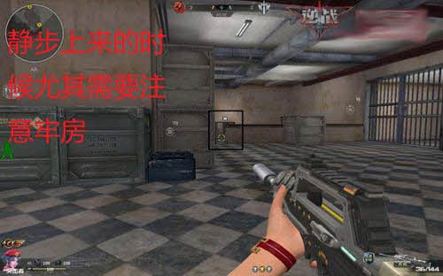 首先注意一下小编的位置和小编鼠标点的B侧门位置,当你到达小编位置的时候,如果有敌人从中路偷B侧门,那么他会同时出现在图上的位置;所以交火点就在小编上图的位置,因此不管有没有人从中路过来B侧门,都希望大家可以保持过这里的时候鼠标停留在B侧门方向,比较安全一点;