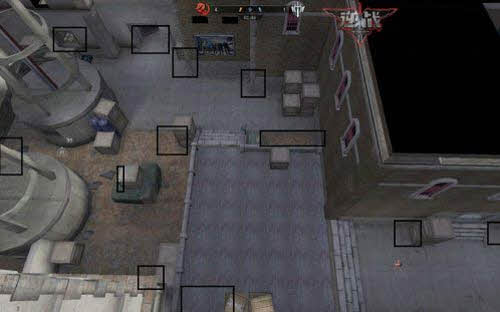 最后小编给大家看一张突击者进入B点后的鸟瞰图,希望各位版友看到这里不要太过于眼花缭乱哦。小编图上的黑色框框都是可能有敌人埋伏的点,光是一个B包点就可能有十二处威胁,但是在6V6的比赛中,