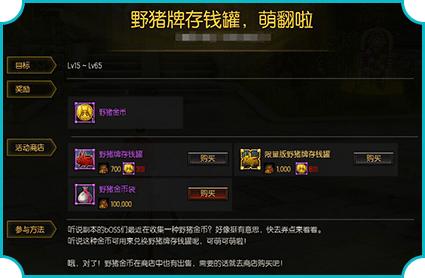 2活动期间,击杀副本boss将100%获得"野猪金币"(讨伐副本掉落概率为50%);