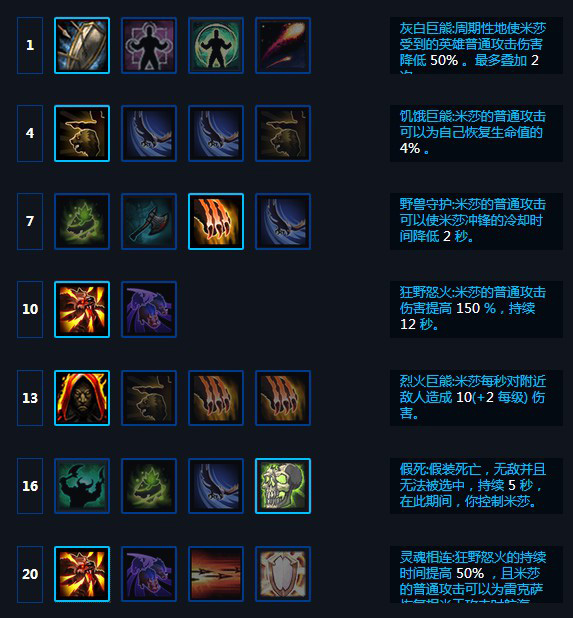 天赋选择:1级格挡(回血米沙不缺,1球1回血收益也不高),4级米沙普攻回血(将生存率大大提高,也可以升级Q提高减速效果,提高雷克萨生存),7级米沙普攻减W技能CD ,10级小红人,13级米沙版火焰斗篷,16级假死,20级提高小红人效果。