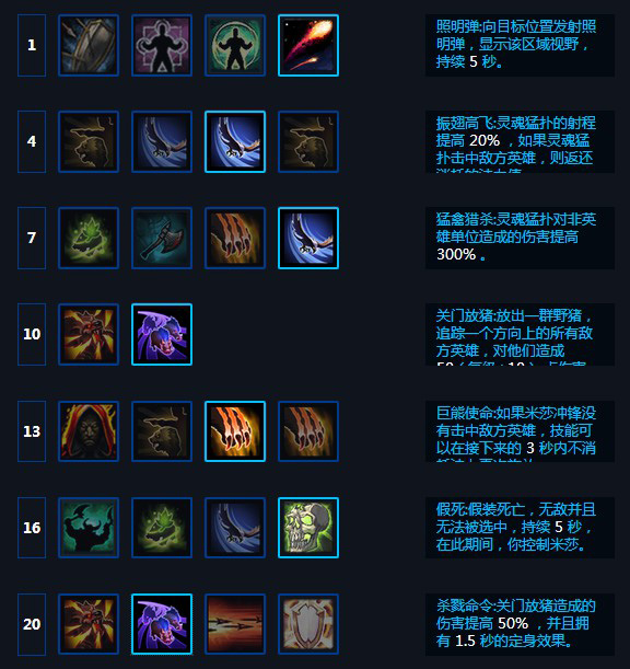天赋选择:1级照明弹(反偷袭与偷野),4级Q加距离,7级Q加300%伤害,10级野猪(伤害感人的团控),13级W不中英雄再W(二段冲锋,打野增加效率,比佣兵统领有用),16级假死,20级猪效果提升