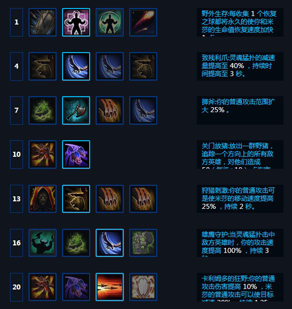 天赋选择:1级吃球回血(主要是给本体回),4级Q加减速效果,7级加普攻距离,10级野猪,13级普攻加速,16级Q提高攻速,20级提高米沙减速和本体伤害