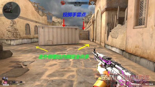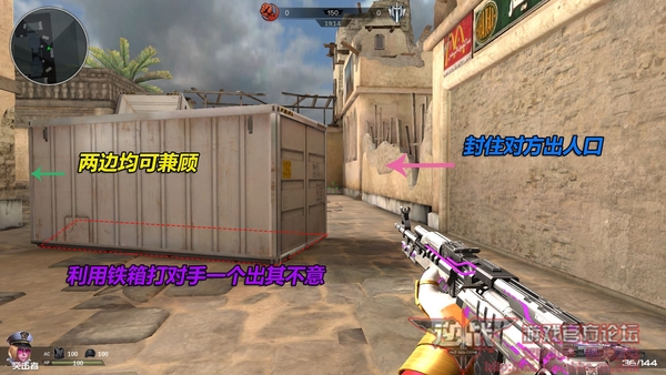 再往前走就要压到对方家了,打团队压家基本是只亏不赚的买卖,所以个人不建议压家。利用对手的大铁箱作为掩体来进行一个左右的游走是一个不错的选择。对方想要从大道出就必须经过这里,你卡在铁箱后听着对方的脚步身判断形势,利用近身卡爆头线的优势打对方一个瞬秒,轻轻松松就可以连杀入手。不过这里容易遭受反弹雷的袭击,并且对于桥方向的视野并不是很好,经常容易被桥方下来的人背袭,所以只能祈祷队友卡主桥口了。