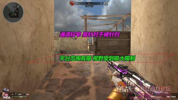 而桥上的位置并不适合交火,尤其是对于步枪手来说,因为桥上平台的空间有效,很难灵活移动,并且上桥的过道较窄,很容易被狙击针对,即使上到桥后,因为墙壁与木箱的关系对于射击是很大的阻碍,所以不建议玩家们在这里蹲点交火。