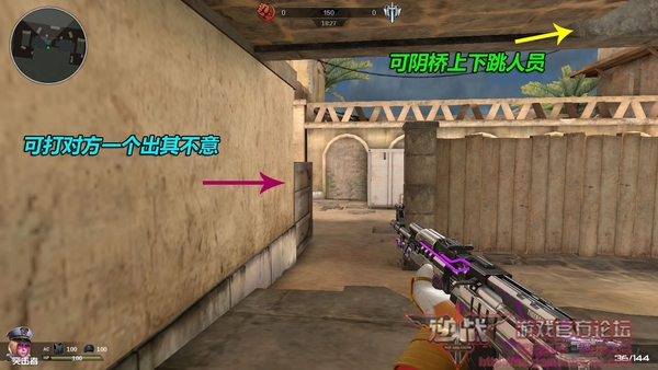 而下桥后的位置就要好上许多,对于喜欢阴人的玩家来说此处是恶心对手的最好点位。在这里可以听到桥上的玩家脚步声,对于桥上下跳的人员可以第一时间阴到。而对于主道方向的敌人来说,一旦开始游戏主道的交火就不曾停歇,对方并不能一心的区针对你,而该处又属于动点,想要针对起来也是相当麻烦,而你只需瞄准好方向看到人射击就可以了。
