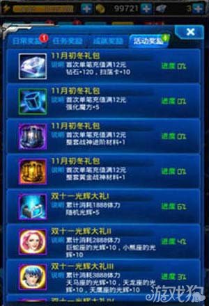 (1) 活动奖励:十一月活动初冬礼包,这次活动是充值反馈活动,首次充值满12元送整套战神零件,还有一套黄金战神材料。