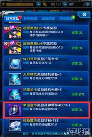 (2) 幸运币抽奖:每天进行三次幸运币抽奖,就可以获得一套战神零件ABCD奖励!这个是很划算的,花费30钻可以进行一次幸运币。也就是说每天花费90钻,就可以获得一套战神零件套装,以及很多道具金币!